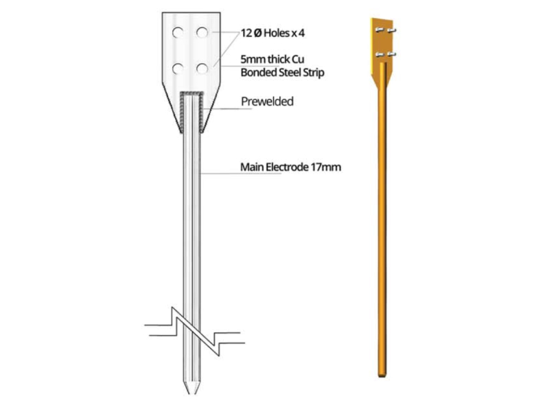 Maintenance Free Chemical earthing electrode made of 17mm dia steel high tensile EN-8DGrade Rod With Copper bonding of minimum of 60microns having pre welded copper bonded connection at top and M17 threaded at bottom for coupler attachments the length of the rod shall be 3 meter long. The terminals shall have 4 holes of 12mm for connection of stip/cable etc.